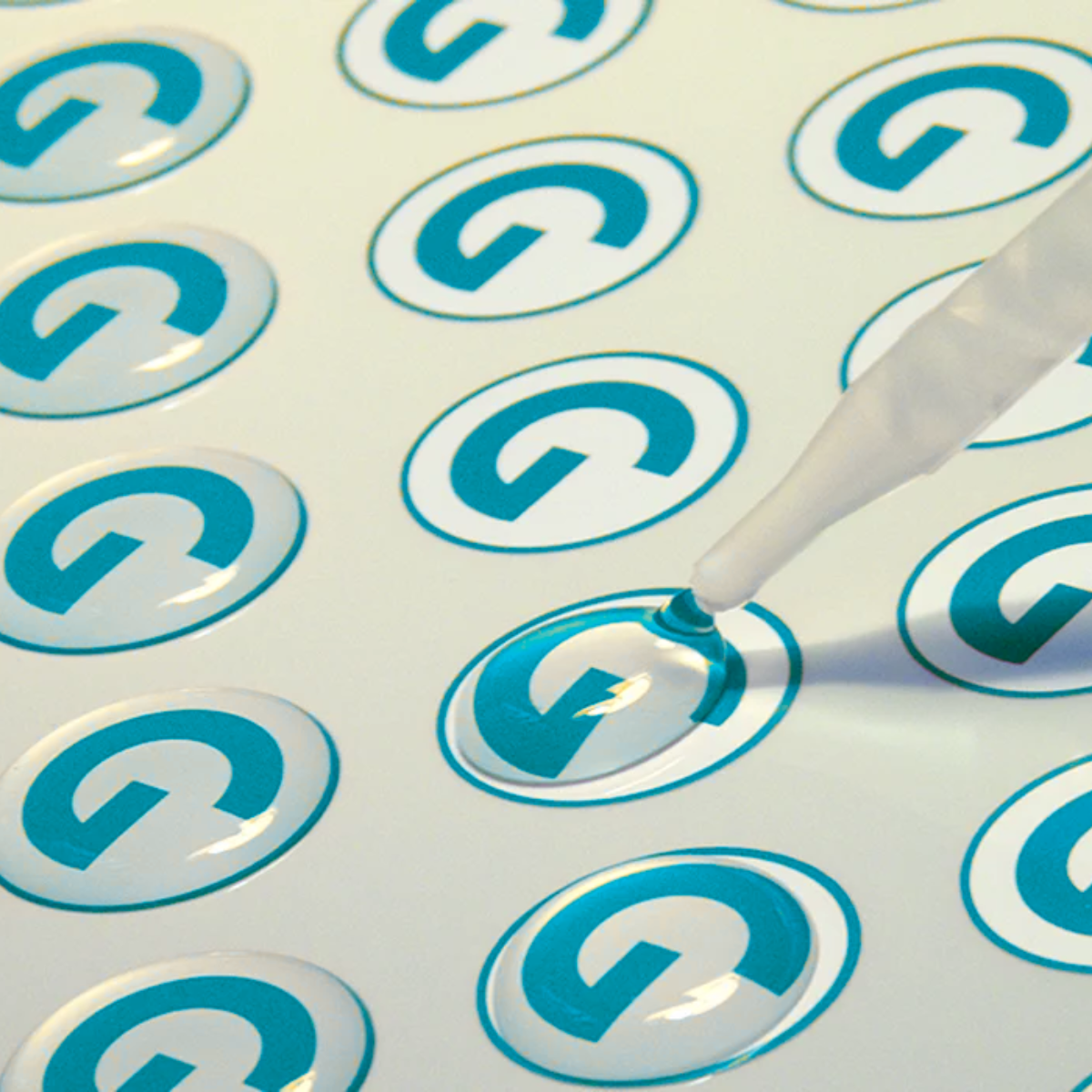 Le doming applique une résine sur une étiquette imprimée en quadrichromie.