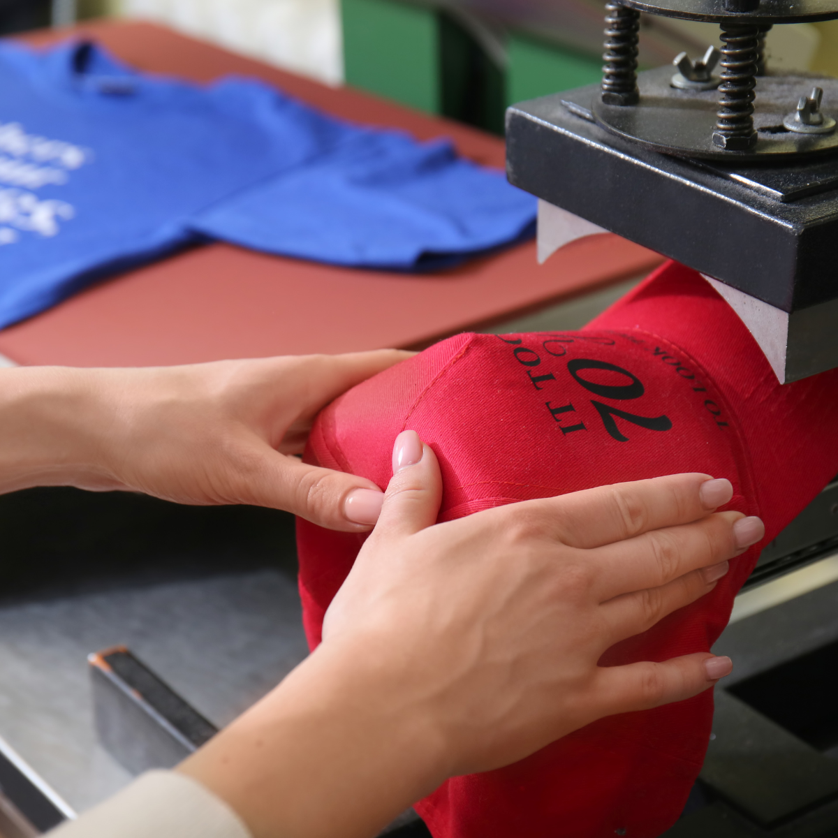 Le transfert sérigraphique imprime sur un support papier thermocollé qui est ensuite pressé sur le textile.