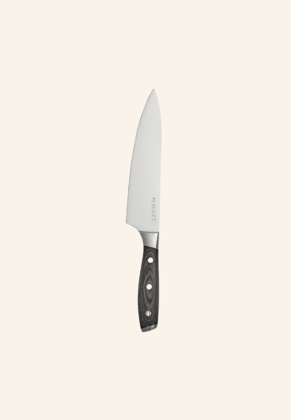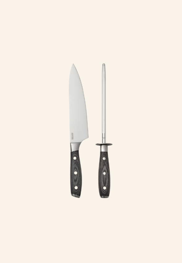‱ Couteau de chef en acier allemand X50CrMoV15 et fusil, manche en pakkawood
