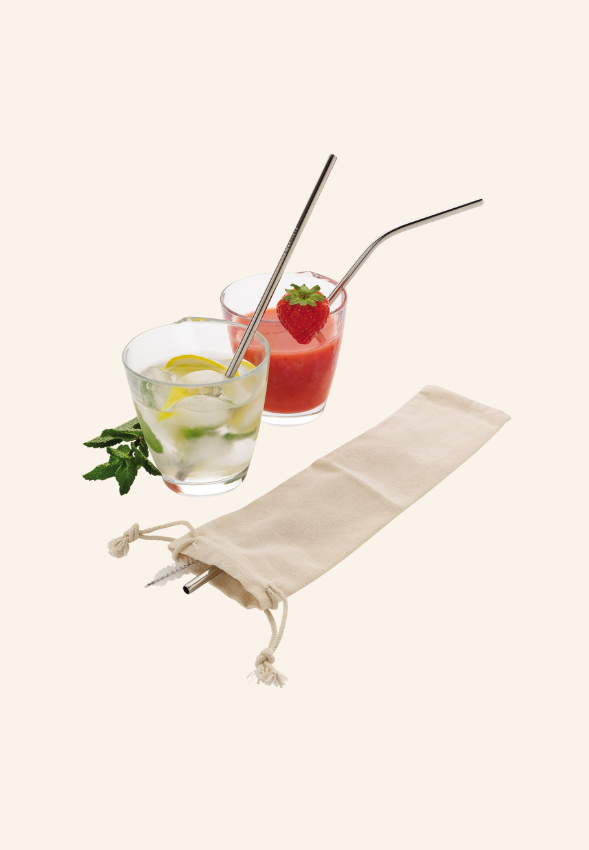 ‱ Set de 3 pailles inox (2 droites + 1 courbĂ©e) avec brosse et pochette coton