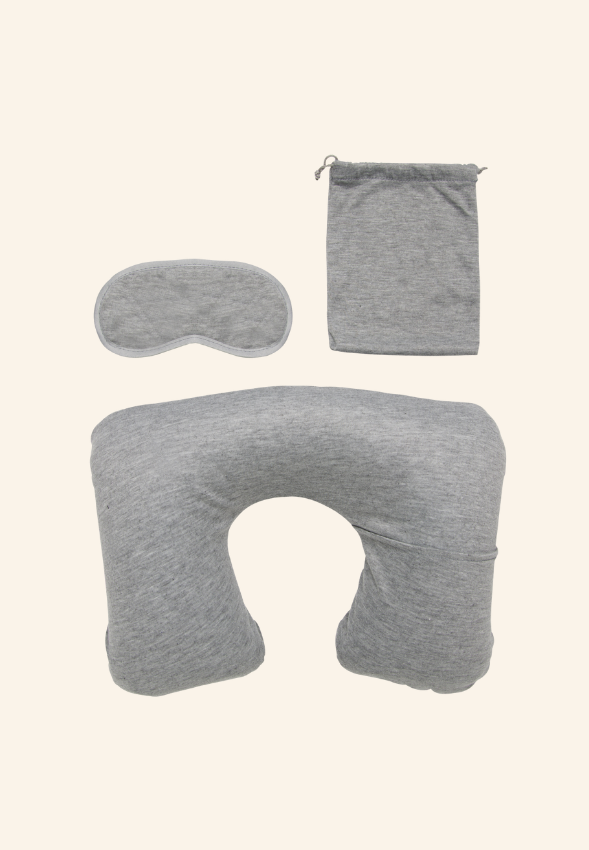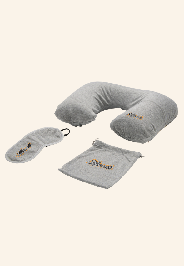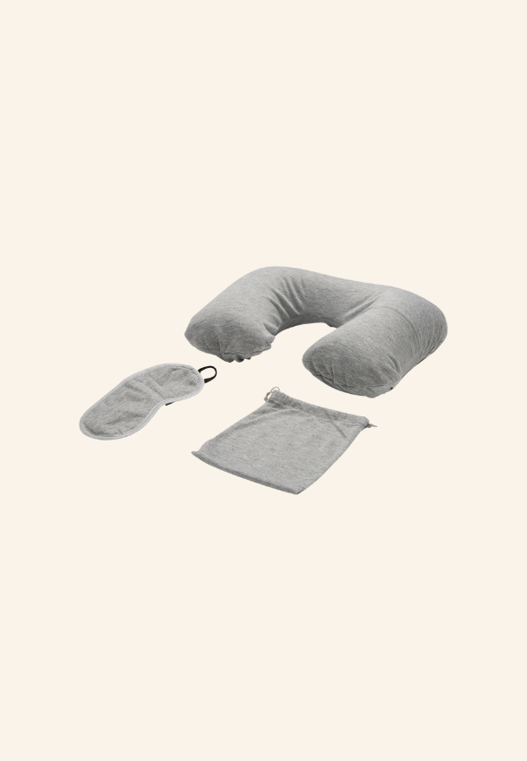 ‱ Set dans un Ă©tui souple avec cordon – coussin gonflable en PVC, masque de nuit et bouchons d’oreille en plastique.