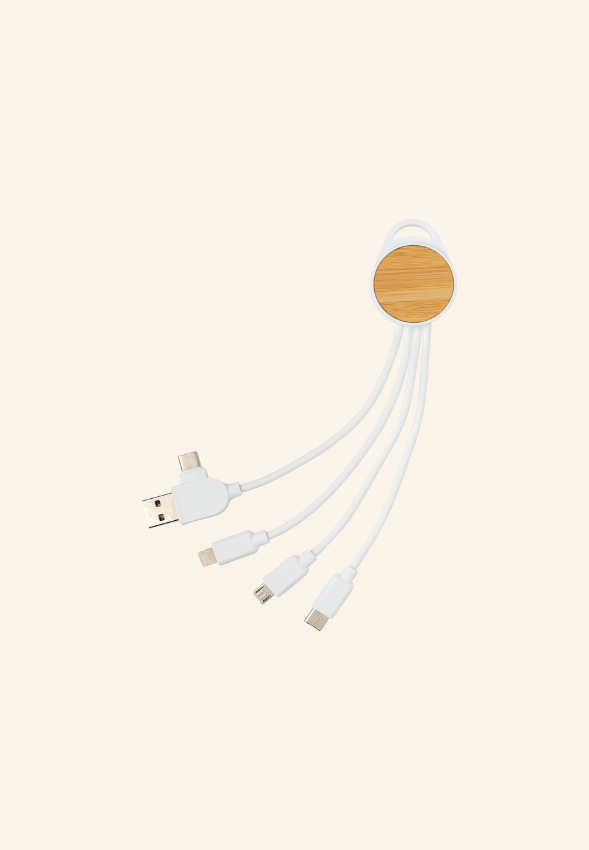 • Câble universel compact 20 cm – câble rond en TPE avec boîtier en bambou FSC® et ABS recyclé certifié RCS, 82 % de contenu recyclé. Double entrée USB-C et USB-A, trois sorties (Lightning, USB-C, micro USB), intérieur en cuivre épais avec PCBA pour une charge sûre. Sans PVC. Livré dans un fourreau en kraft FSC® mix.