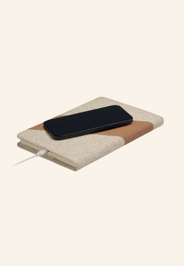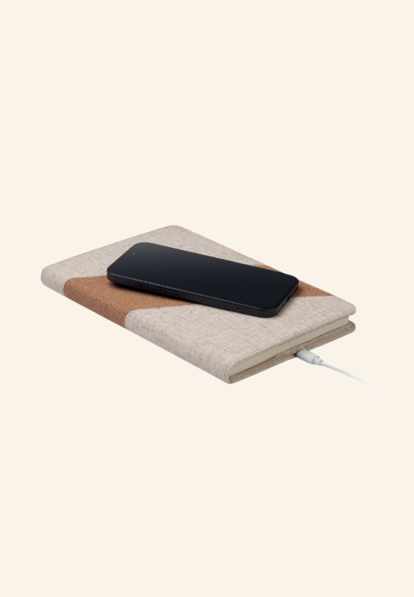 • Carnet 2 en 1 avec chargeur sans fil intégré 15W.
