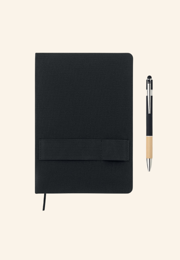 • Couverture rigide en feutre RPET 600D pour un rendu moderne et responsable.