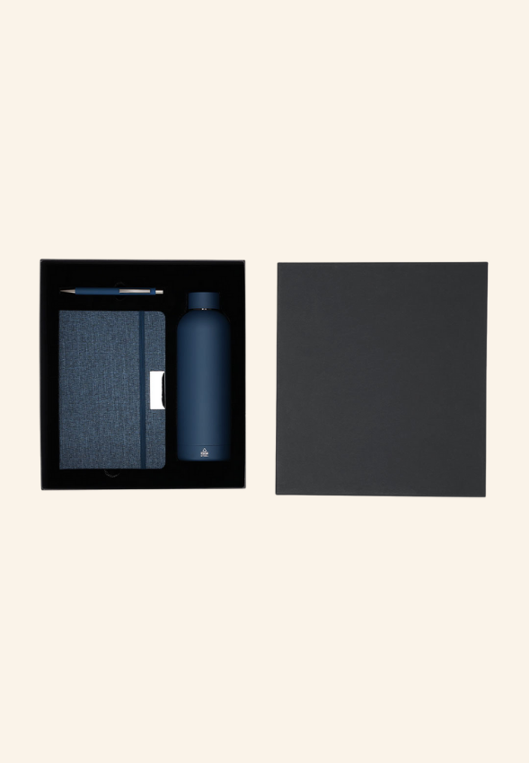 • Coffret complet avec bloc-notes, stylo et bouteille thermique pour un usage quotidien.