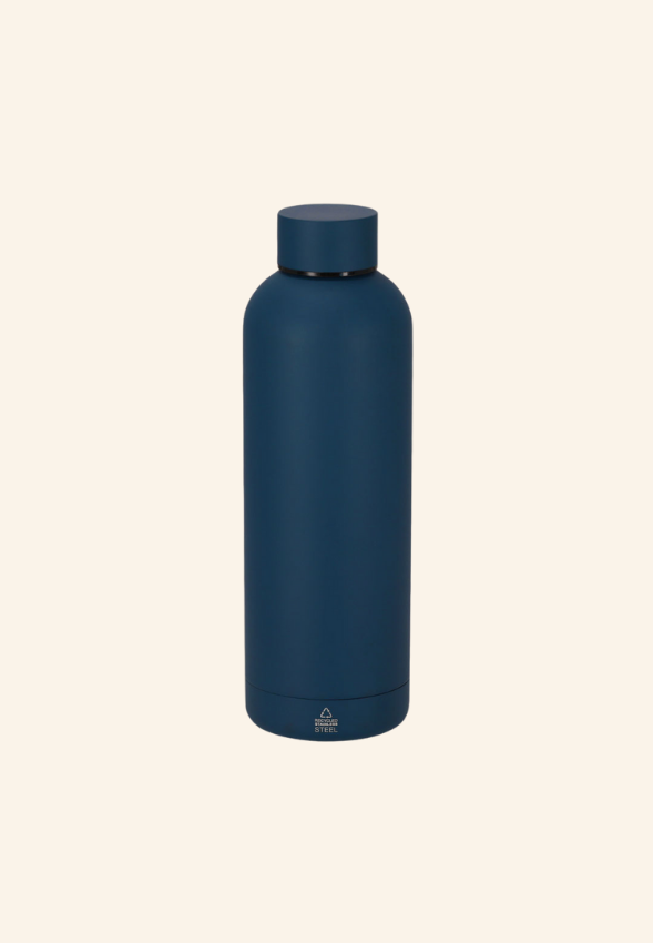 • Contenu : bloc-notes couverture rigide RPET (80 pages), stylo bille aluminium recyclé, bouteille thermique acier inoxydable 500 ml