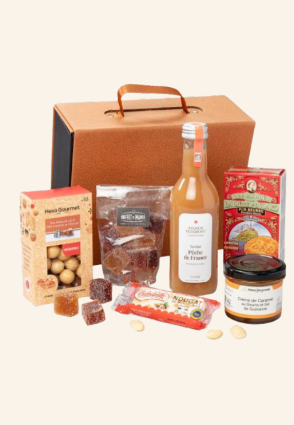 PrĂ©sentĂ© dans un Ă©lĂ©gant coffret en simili cuir havane, ce cadeau gourmand cĂ©lĂšbre le savoir-faire artisanal français Ă  travers une sĂ©lection de douceurs raffinĂ©es et authentiques. Un moment de dĂ©gustation dĂ©licat qui allie tradition, gĂ©nĂ©rositĂ© et touche d’exception.