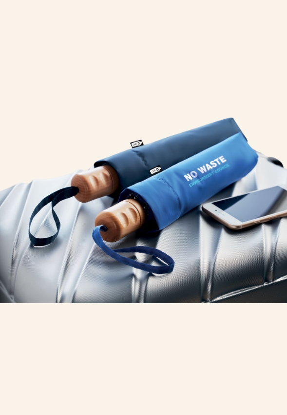 Je suis Faryon, un parapluie pliable robuste et durable avec toile en RPET recyclé et manche en bois, parfait pour vous protéger de la pluie au quotidien.