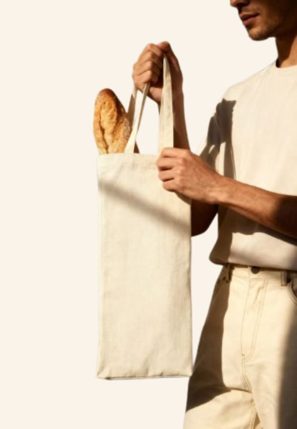 Je suis Élior, un sac à pain pratique et durable, fabriqué en coton 100% de 140 g/m². Je permets de conserver vos pains tout en respectant l’environnement grâce à ma matière naturelle et résistante.